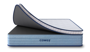 topper-for-coway-prime-lite-series-mattress-getting-changed-on-top-of-a-blue-mattress-with-the-coway-logo-on-the-front